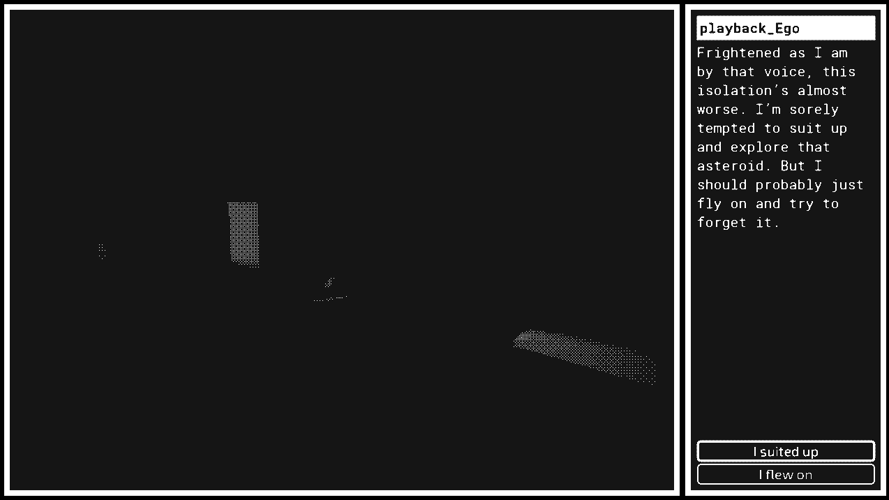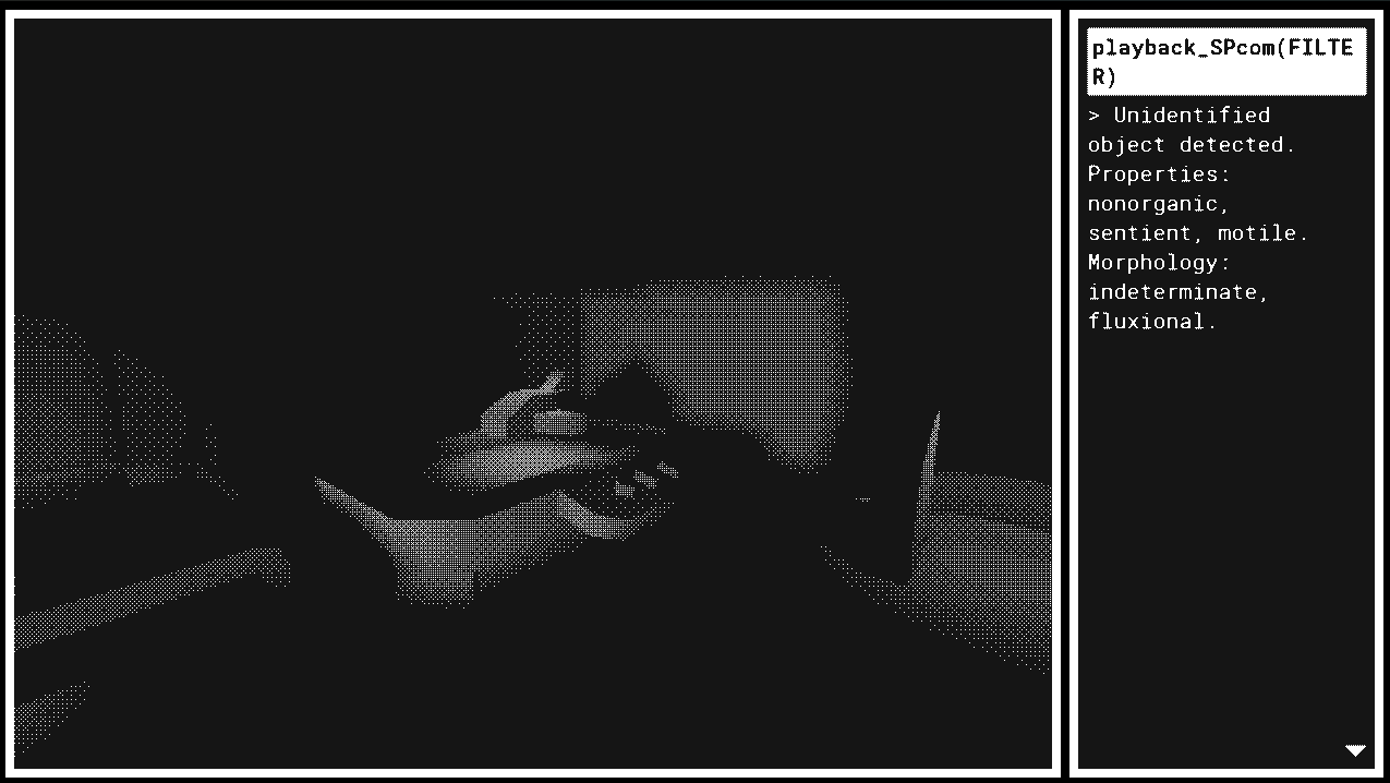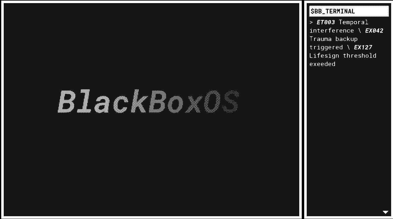 BlackBoxOS is a 1-bit first-person visual novel. Uncover the last moments of deep space pilot attempting to survive as their escape pod hurtles into the depths of a black hole. Read the pilot's thoughts with BBOS's patent-pending ThoughtLog technology, and crystal clear 1-bit bodycam playback. // Interaction is minimal, but we hope you enjoy the atmosphere and the scenarios! Post-jam update next weekend.